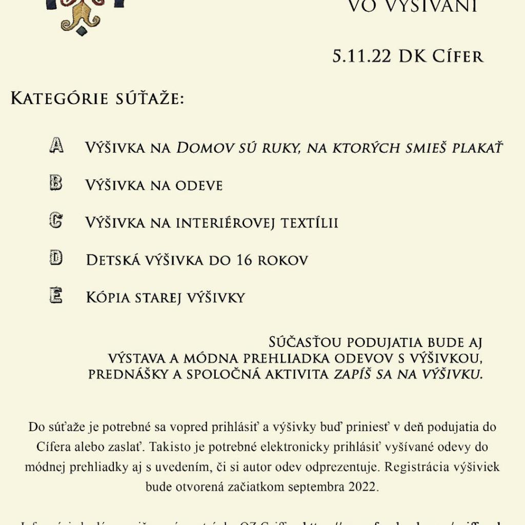 Občianske združenie CZIFFER si Vás dovoľuje pozvať na šiesty ročník celoslovenskej súťaže Márie Hollósyovej vo vyšívaní, ktorý sa uskutoční v sobotu 5. 11. 2022 v Cíferi. Súťaží sa v piatich kategóriách, jedna je venovaná deťom do 16 rokov. Súčasťou podujatia bude aj výstava a módna prehliadka odevov s výšivkou, prednášky a spoločná aktivita Zapíš sa na výšivku.