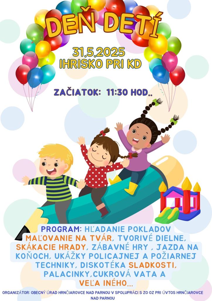 Obecný úrad Hrnčiarovce nad Parnou v spolupráci s ZO OZ pri ÚVTOS Hrnčiarovce nad Parnou a KŠP Hrnčiarovce nad Parnou pozýva na oslavu MDD, ktorá sa uskutoční dňa 31.05.2025 v areáli ZŠ v Hrnčiarovciach nad Parnou ul. Farská 37, od 11.30 hod.