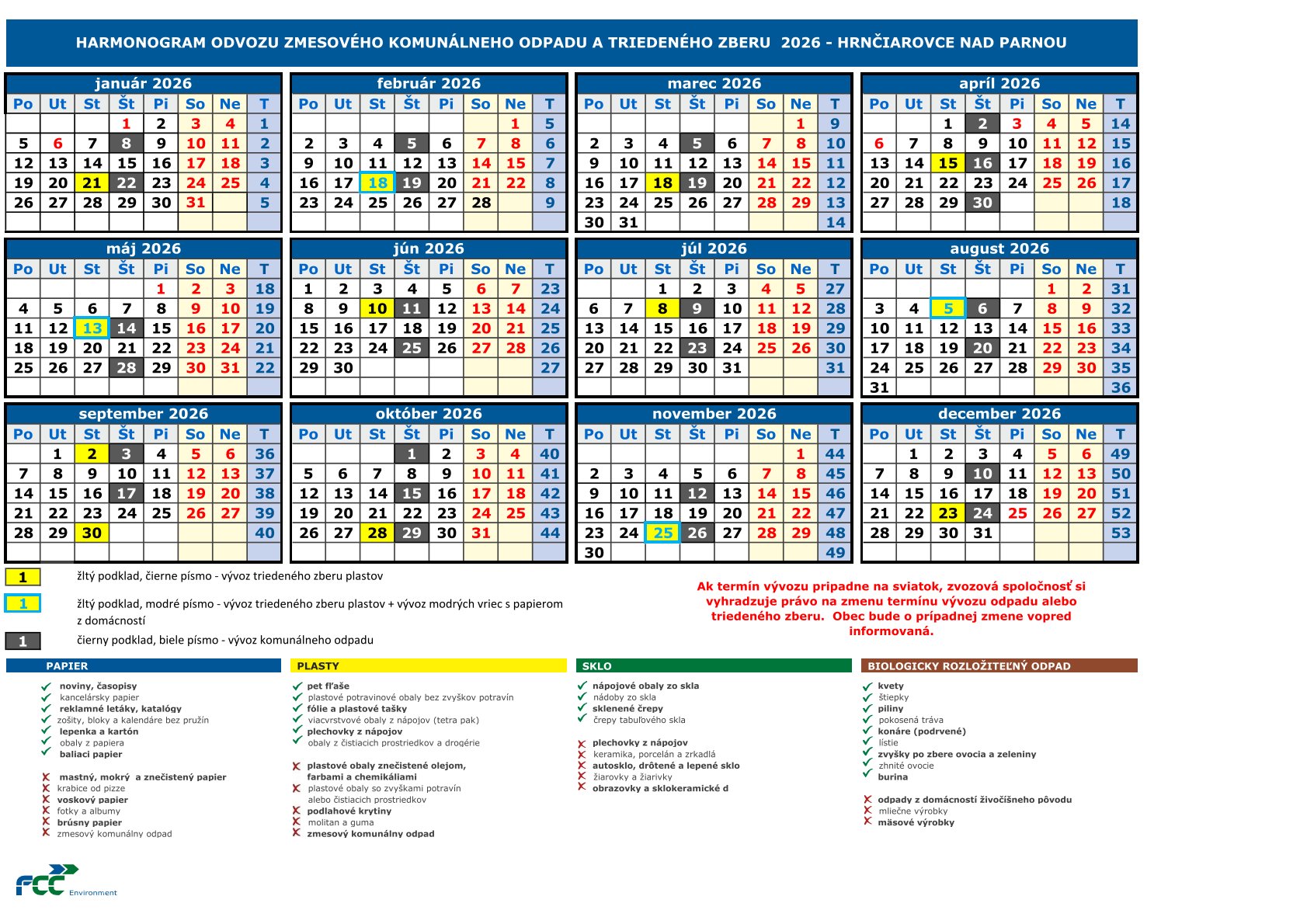 Harmonogram odvozu zmesového komunálneho odpadu a triedeného zberu 2026