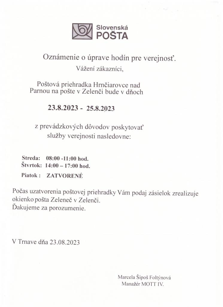 Okienko Hrnčiarovce-Pošta Zeleneč -Oznam o úprave hodín pre verejnosť