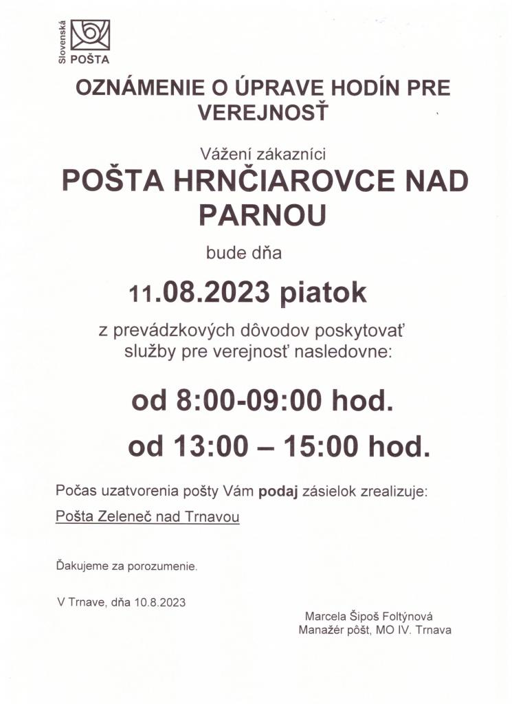 Okienko Hrnčiarovce-Pošta Zeleneč -Oznam o úprave hodín pre verejnosť na 11.8.2023