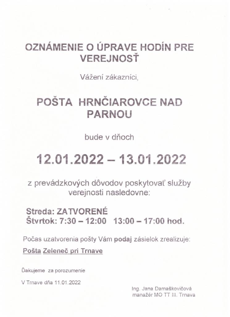 Oznam o úprave hodín pre verejnosť-Slovenská pošta