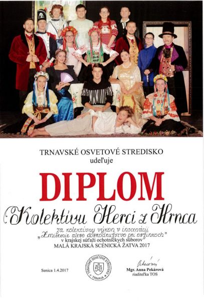 Ďakujeme našim hercom z Hrnca za úspešnú reprezentáciu Obce Hrnčiarovce nad Parnou v krajskej súťaži ochotníckych súborov na “Malej krajskej scénickej žatve 2017”v Senice, kde získali krásne 2. miesto s návrhom na postup do celoštátneho kola a ďalej im bolo udelené ocenenie za kolektívny výkon v inscenácii “Zmierenie alebo dobrodružstvo pri obžinkoch”.