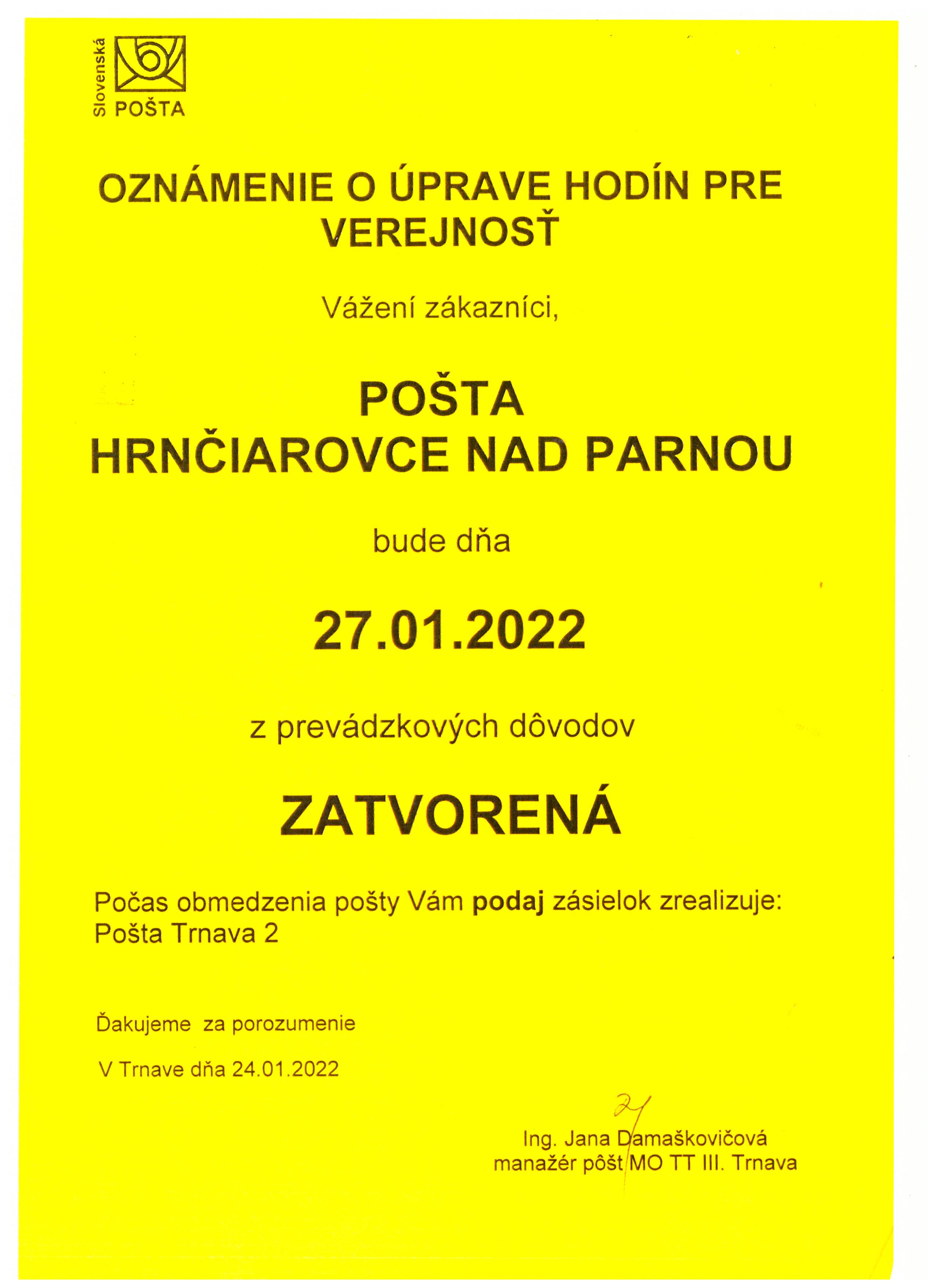Pošta bude vo štvrtok 27.1.2022-ZATVORENÁ