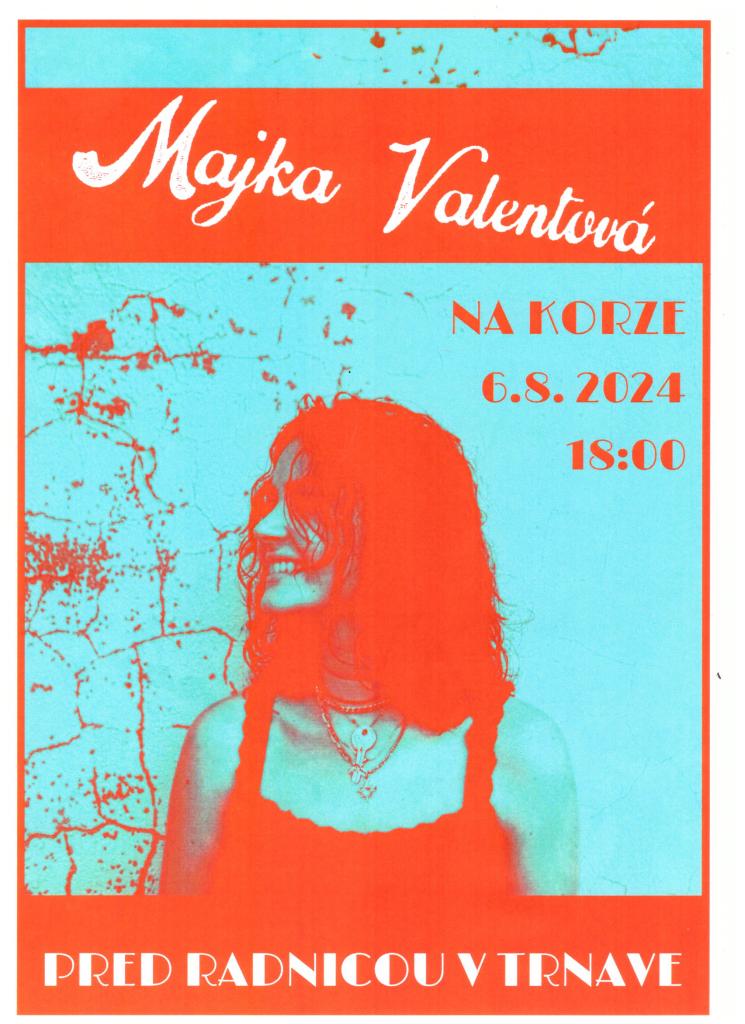 Pozývame Vás na vystúpenie Majky Valentovej, ktoré bude v utorok 6.8.2024 o 18.00 hodine pred mestskou radnicou v Trnave.