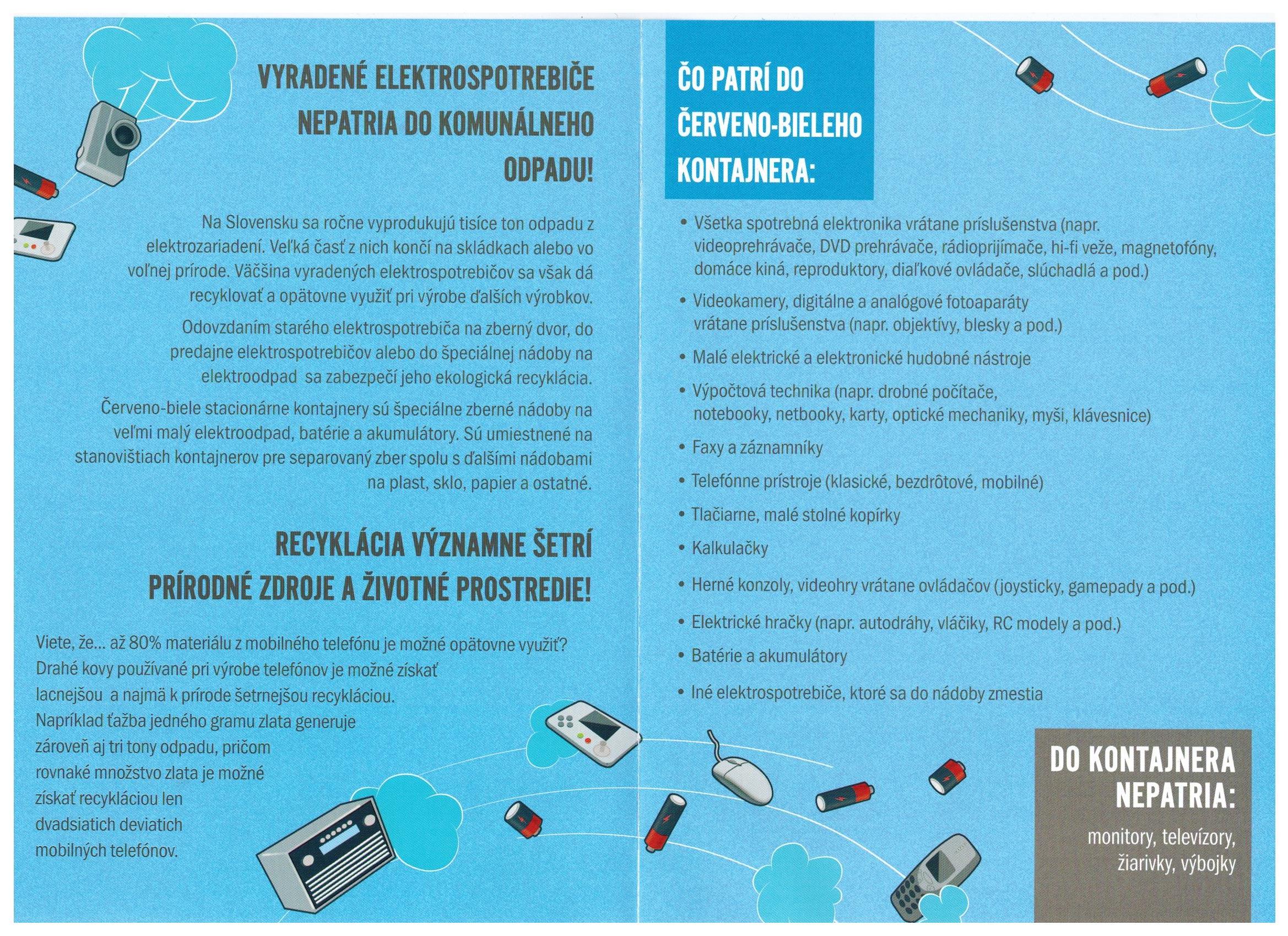 Obecný úrad oznamuje občanom, že za parkoviskom pri kultúrnom dome je umiestnený nový červeno-biely kontajner na spotrebnú elektroniku. Kontajner je určený na použité batérie, mobilné telefóny, notebooky, počítače, myši, klávesnice, fotoaparáty, kamery, kalkulačky, kulmy, fény, žehličky a iné menšie elektrospotrebiče. Veľkú bielu a čiernu techniku (chladničky, práčky, televízory a pod.) je potrebné odovzdať na zbernom dvore.