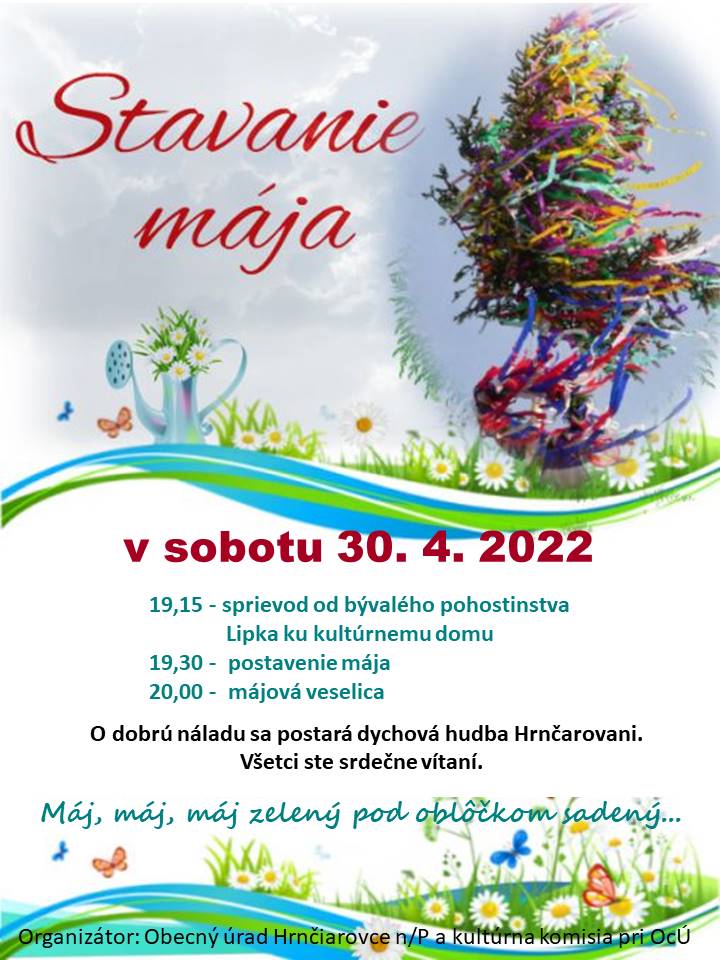 Vážení občania, srdečne Vás všetkých pozývame na tradičné stavanie mája, ktoré sa bude konať túto sobotu 30.4.2022, so začiatkom o 19.15 hodine pred bývalým pohostinstvom Lipka. O dobrú náladu sa postará dychová hudba Hrnčarovani.