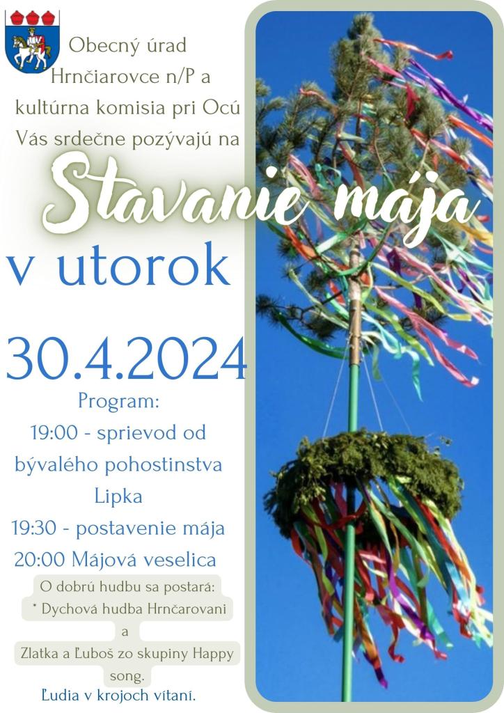 Obecný úrad Hrnčiarovce nad Parnou a kultúrna komisia pri OcÚ Vás srdečne pozývajú na STAVANIE OBECNÉHO MÁJA.