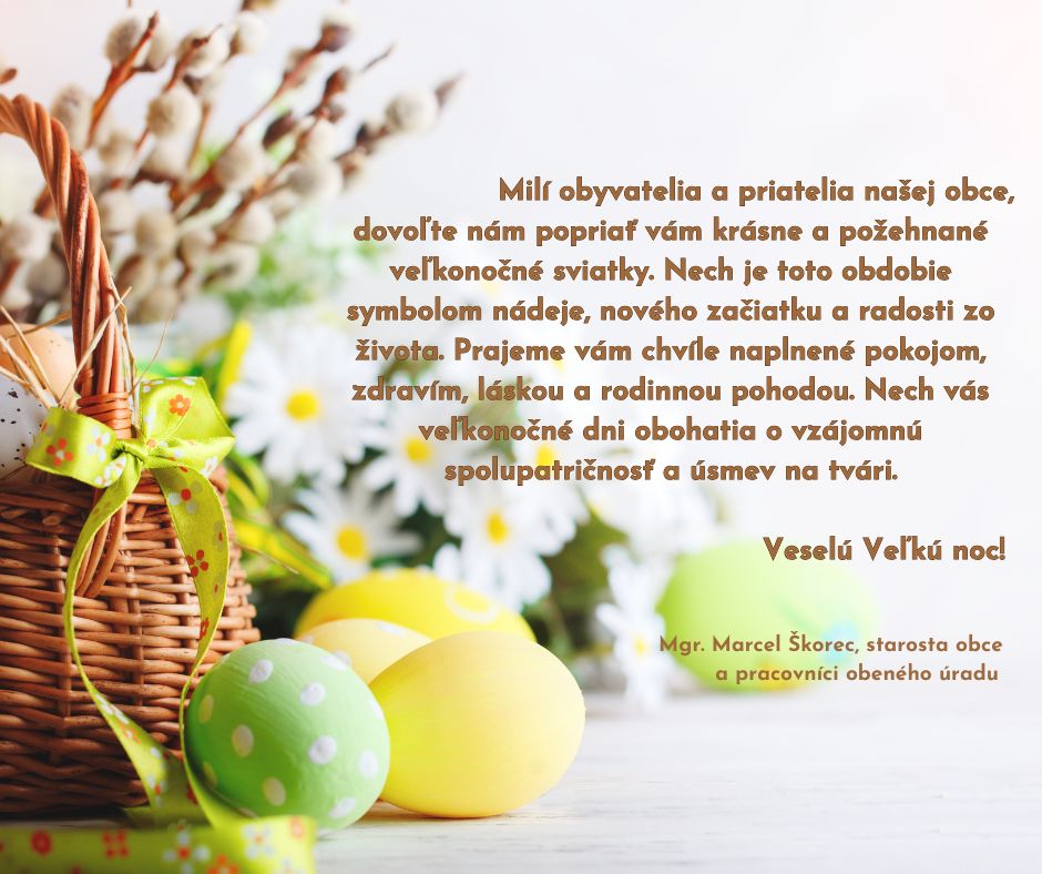 dovoľte nám popriať vám krásne a požehnané veľkonočné sviatky. Nech je toto obdobie symbolom nádeje, nového začiatku a radosti zo života. Prajeme vám chvíle naplnené pokojom, zdravím, láskou a rodinnou pohodou. Nech vás veľkonočné dni obohatia o vzájomnú spolupatričnosť a úsmev na tvári.