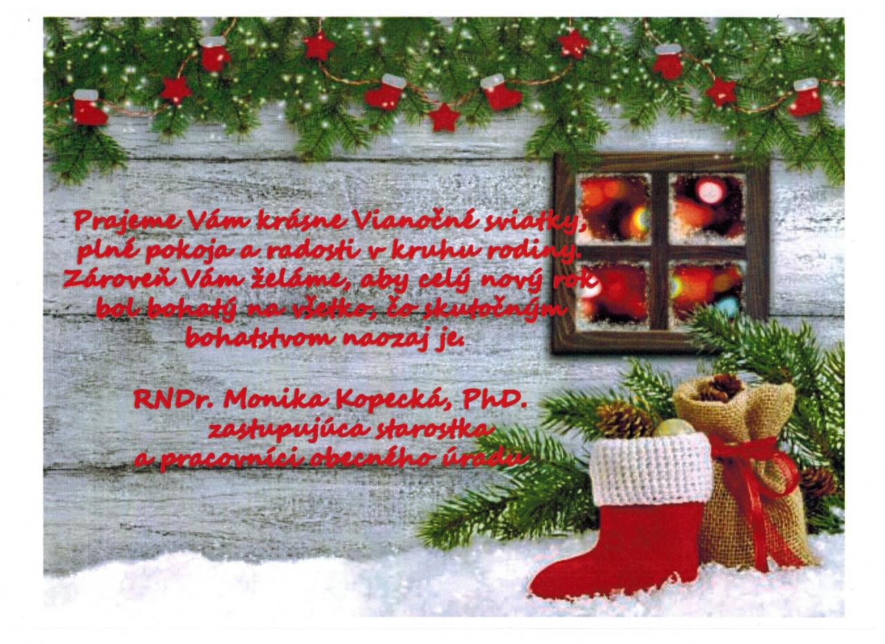 Kolektív pracovníkov obecného úradu Vám všetkým želá pokojné prežitie vianočných sviatkov, radosť a rodinnú pohodu v kruhu Vašich blízkych a úspešný štart do nového roku 2020.