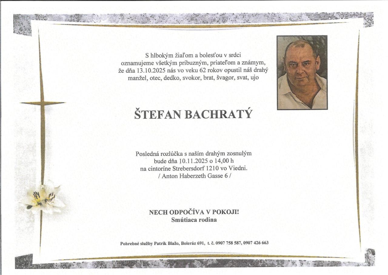 S hlbokým zármutkom oznamujeme, že nás dňa 13.10.2025 navždy opustil náš rodák pán Štefan Bachratý vo veku 62 rokov.
