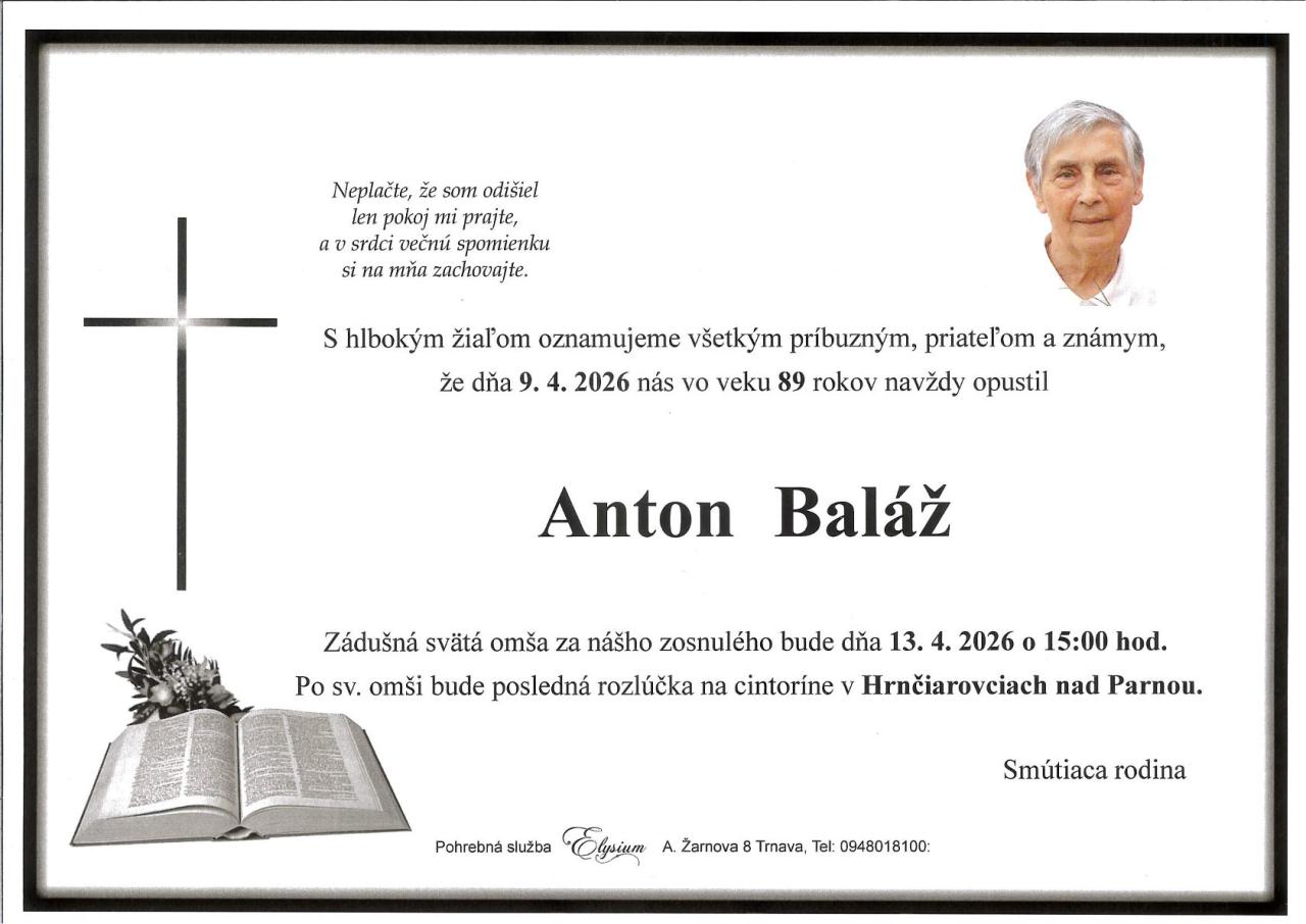 S hlbokým zármutkom oznamujeme, že nás dňa 09.04.2026 navždy opustil náš spoluobčan pán Anton Baláž vo veku 89 rokov.