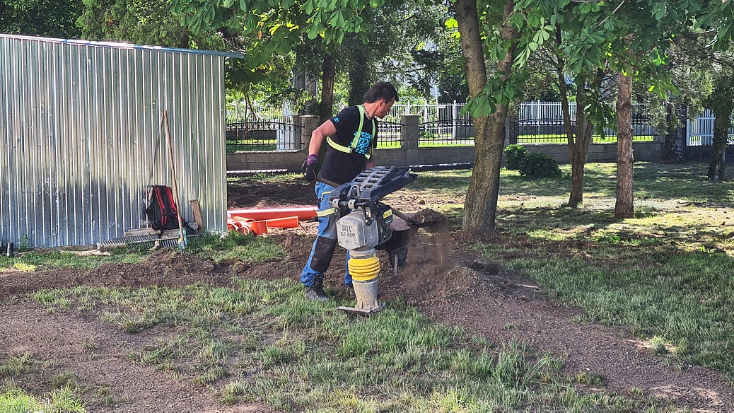 Sú uložené uzemňovacie pásy bleskozvodov do vykopaných rých a následne budú napojené na bleskozvody. Komplet sú napojené dažďové zvody do potrubia na odvod dažďovej vody do vsakovacích jám. Vybúrané sú staré schody a budú spravené nové. Dokončiť treba terénne úpravy a zatrávniť.